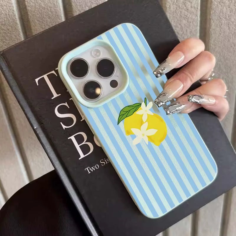 Inspirada nos verões italianos e na doçura do limão siciliano, a Case Amalfi Mood traz uma estampa central charmosa sobre fundo listrado azul claro — uma combinação que lembra guarda-sóis vintage à beira-mar. Leve, delicada e cheia de frescor, é perfeita para quem vive no ritmo da brisa mediterrânea.
